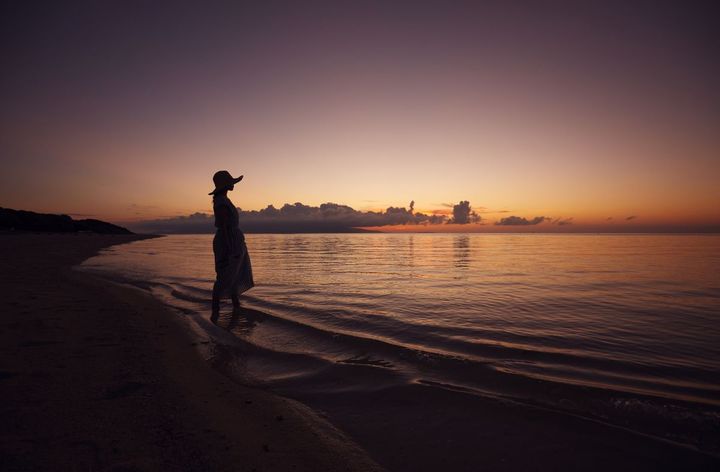 水平線に沈む夏の夕日をゆったりと眺める、浜でのひととき