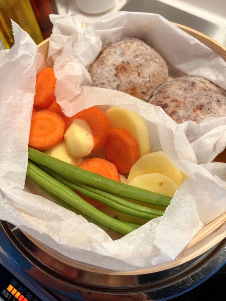 一緒に野菜も蒸して、ハンバーグに添えました♪