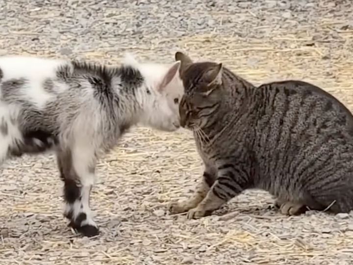 3. 【異色の仲良しコンビ】「ごつん」が挨拶? 猫と子ヤギの不思議なコミュニケーション