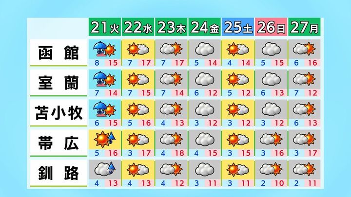 水曜は晴れますが、海岸部で風のやや強い状態が続きます。その後も天気の大きな崩れはないでしょう。最高気温は平年並みの日が多く、函館や帯広は15度くらい、その他は12度前後です。