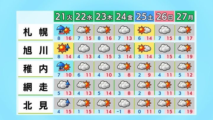 金曜日にかけて雲が広がりやすいでしょう。土曜日は広く晴れる見込みです。最高気温は札幌や旭川で15度くらいですが、稚内やオホーツク海側は一ケタの日もあるため、服装選びに気を付けて下さい。強風や乾燥にも注意が必要です。