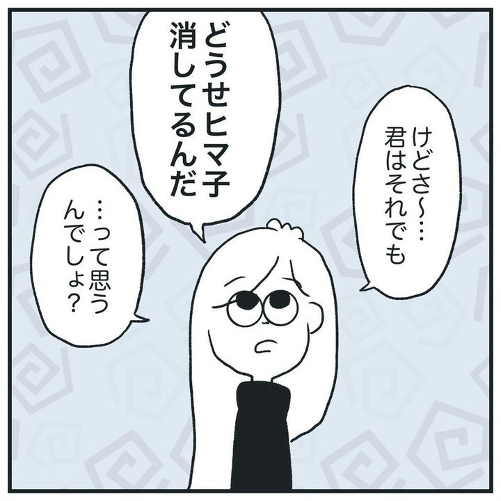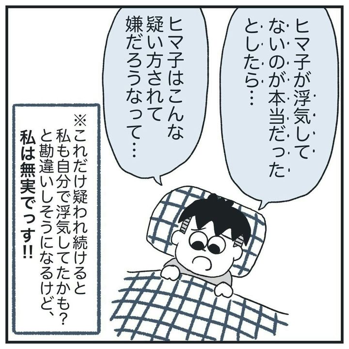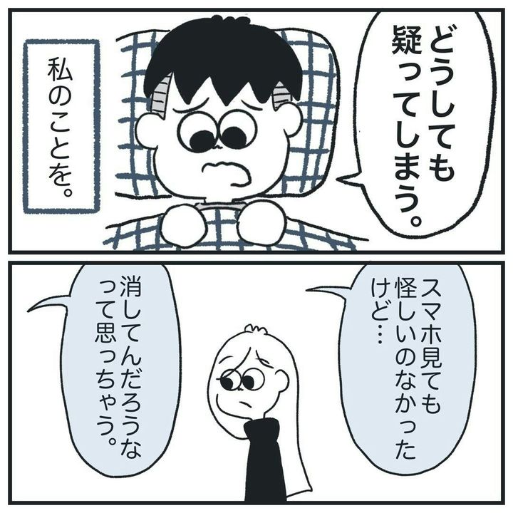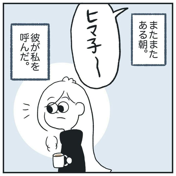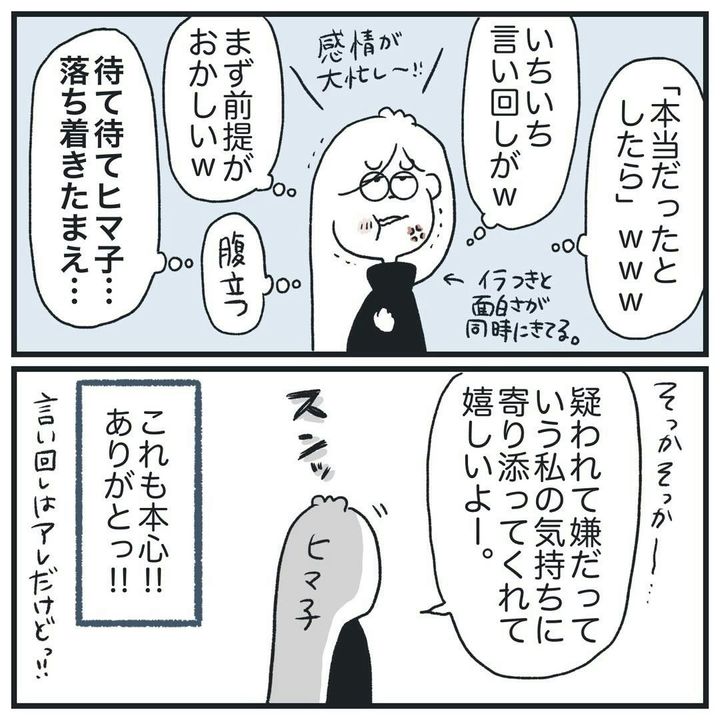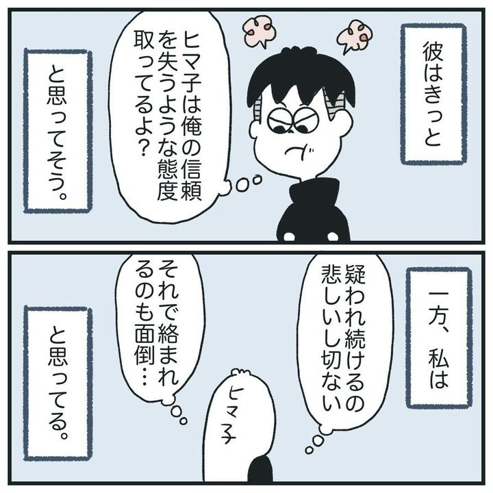 「疑ってしまう」思考は、長年その人自身に染みついてしまったクセのようなもの。簡単に変えることはできませんが、変えられるのは自分だけです。彼氏に寄り添うヒマ子さんの姿に、エールを送りたくなる作品です。