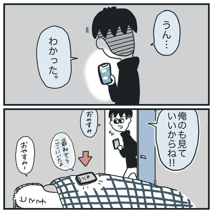 面倒だと感じたヒマ子さんは、寝室へサッサと切り上げます。ところが、寝室にまで来て「スマホを見せて」と言われたのです。嫌悪感を抱きつつ、スマホを差し出します。そして翌朝、彼氏から「怪しいのはなかった、ごめん」と謝罪されます…。