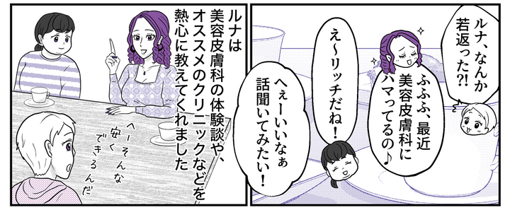 ルナと最後に会ったのはレンを出産する前のことです。むしろ若返っているように見えて驚きました。美容体験談に興味津々の私が次々と質問すると、ルナはどんな施術があるのか、どんなメイクがいいのか詳しく教えてくれました。