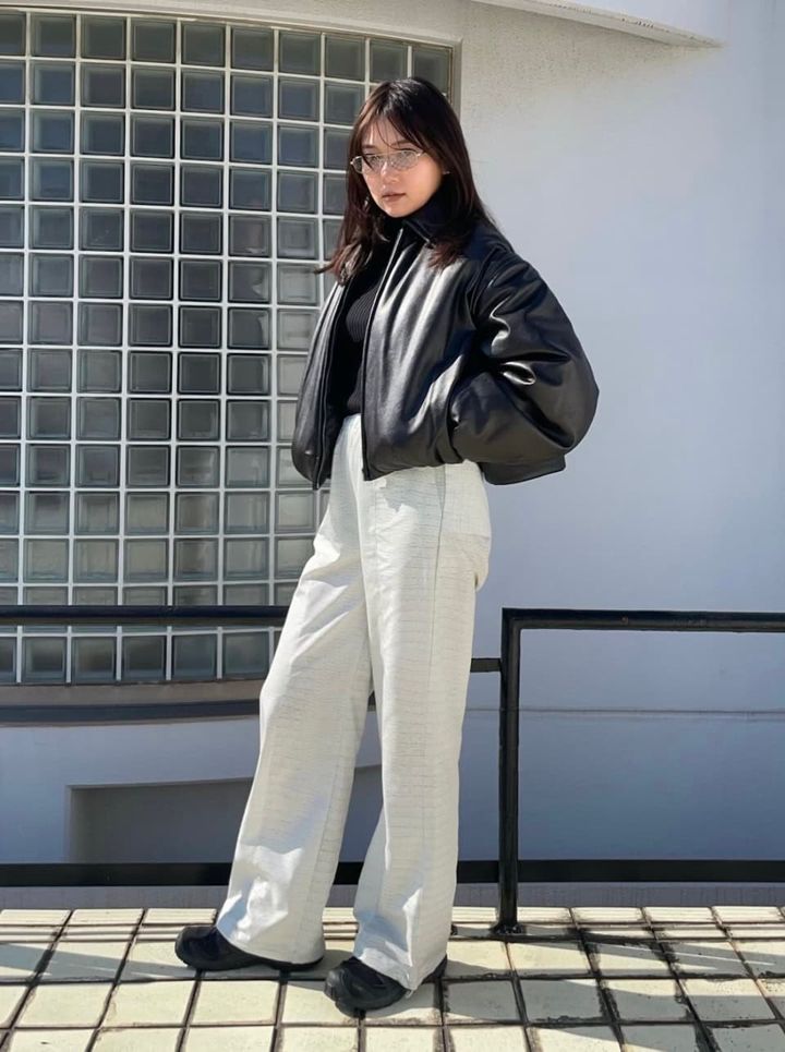 シアーな花柄にレザージャケットを合わせたモードなスタイリングを、ほどよくラフに落とし込む黒縁眼鏡。サングラスほど決まり過ぎず、コーデにアクセントを与えてくれます。