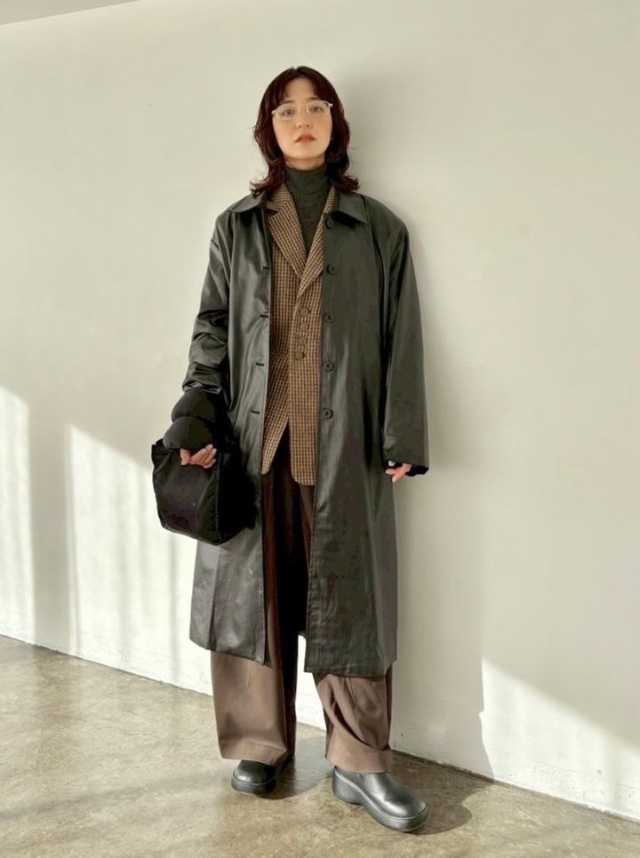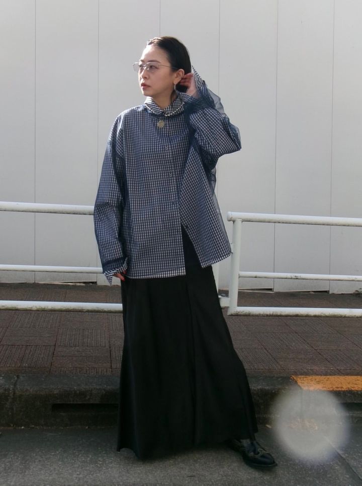 オーバーサイズのシャツにロングスカートを合わせたコーデを、ピリッと辛口に見せてくれるスッキリとしたフレームの眼鏡。オールバックにしたヘアスタイルが、さらに雰囲気を加速させます!