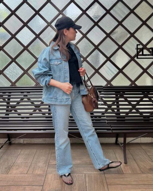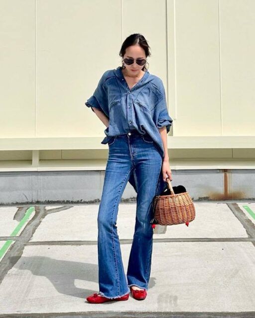 次にご紹介するのはデニムシャツを取り入れたデニムオンデニムコーデ。フレアなバギーデニムパンツを合わせれば、大人っぽく洗練された印象が叶います。シャツのラフな雰囲気とバギーなボトムシルエットが、やわらかさとヘルシーな抜け感をプラス。