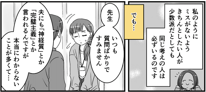 私のように、ミスがないようにきちんとしたい人が少数派だとしても、同じ考えの人は必ずいるんです。わからないままにしておくのはストレスです。その後、先生に私は細かいところが気になりやすく、家でも「神経質」や「完璧主義」と言われることがあることを正直に伝えて、謝罪しました。