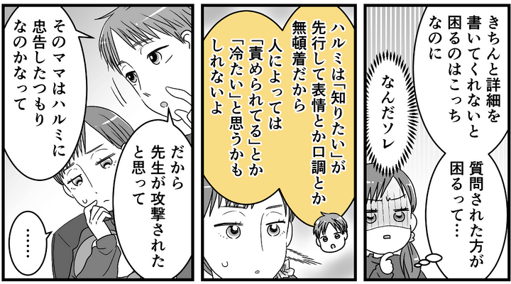 私はハルミ(20代後半)。周りが私を「完璧主義のザ・A型」だと言うので、自分自身もそういう人間だと理解しています。けれど感謝をされるときだってあるし、人に迷惑をかけているつもりはないので、放っておいてほしいと思っていました。その日は幼稚園で集まりがあり、わからないところを先生に質問しただけなのに、ママ友のサトさんに「いちいち揚げ足を取っている」と嫌味を言われたのです。そんなことを言われるとは驚きです。