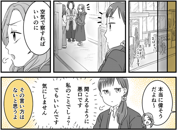 私に聞こえるような悪口です。どうせ私のことでしょう。でもいいんです、相手にしません。そう思っていると、同じクラスの保護者は「その言い方はないと思うよ」と、話しかけてきてくれました。