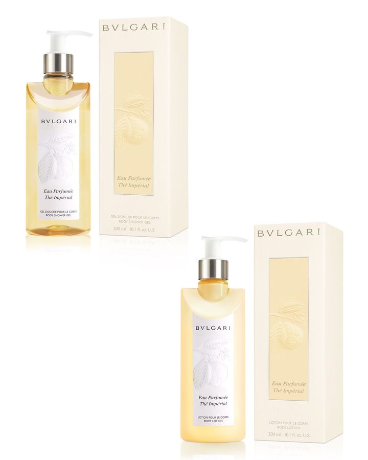 「ブルガリ オ パフメ テ インペリアル シャワージェル」(300mL)¥10,670、「ブルガリ オ パフメ テ インペリアル ボディーローション」(300mL)¥12,210 Hearst Owned