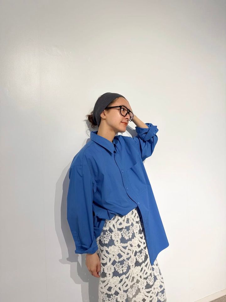 「ルーズなブルーのオーバーシャツにデニムを合わせ、今年気になるレーススカートをアクセントにスタイリングしました。トラッドカジュアルな装いに、さり気なく甘さをプラスしています。ヘアバンドやアイウェアなど、小物で遊び心を効かせたのもポイントです」
