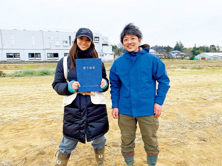 ’22年1月、1年間の過程を終え、アグリイノベーション大学を卒業。終了証を手に、お世話になった千葉先生と。