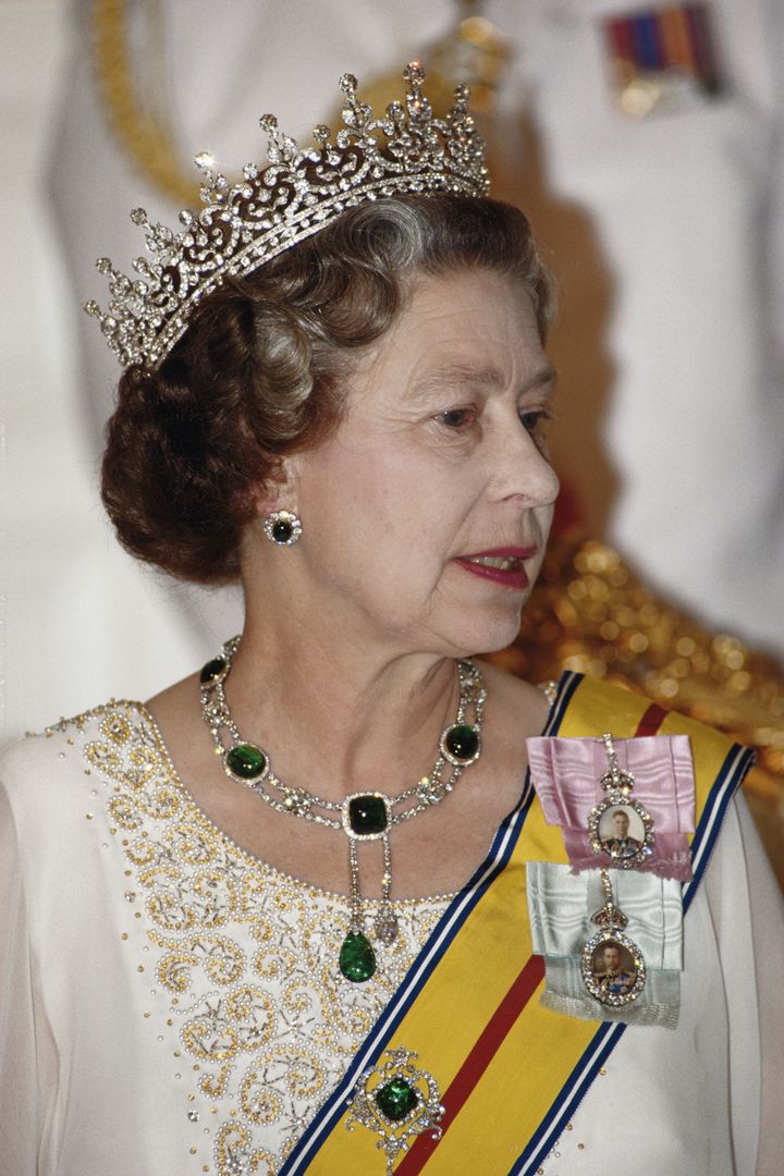 1989年10月14日に女王が身につけた、このエメラルドのネックレスとイヤリングのセットは、「ケンブリッジ・アンド・デリー・ダーバー・パリュール」として知られています。