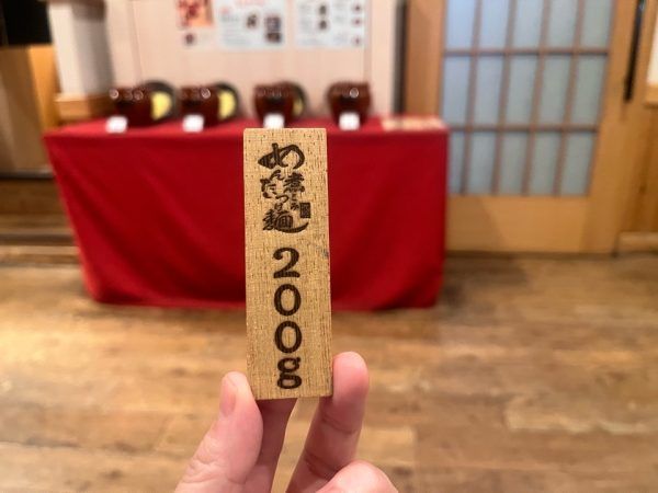 お店に入ったらまず最初に麺の量を選びます。 100g~300gは値段が同じで、100g・200g・300g・400gの中から麺の量を選び、木札を取ります。
