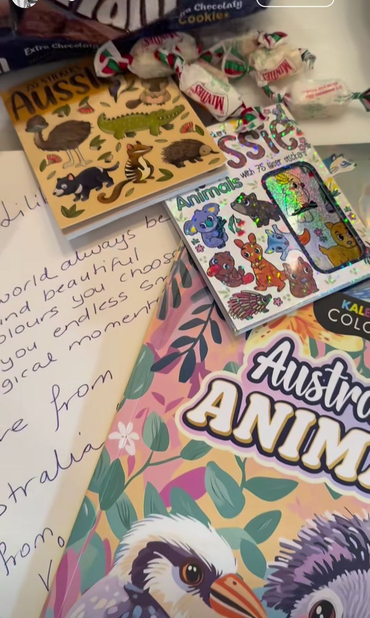 動画には、玄関のドアの上に掲げられた「Welcome Home(おかえりなさい)」と書かれたバナーが映し出されている。夫妻の到着に合わせて、愛犬のラブラドール・レトリバー、プーラが尻尾を振りながら家の中へ入っていく姿も。続いて妃は、オーストラリアの人々から贈られた贈り物や手紙が詰まったケアパッケージ(ギフトセット)を披露。その中には、人気のチョコレート菓子「ティムタム」や、現地の野生動物をテーマにした絵本、ステッカーなどが含まれており、その中には、娘のリリベット王女宛てと思われる手書きの手紙もあった。さらには、妃がティムタムを取って食べるおやつタイムも収められている。