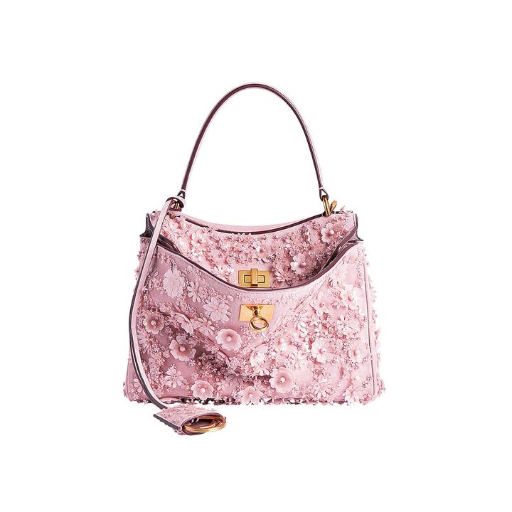 ピエールパオロ・ピッチョーリの就任で、新たな表情を見せるバレンシアガ。ピンクのレザーフラワーが満開の「ロデオ ハンドバッグ ミニ」。