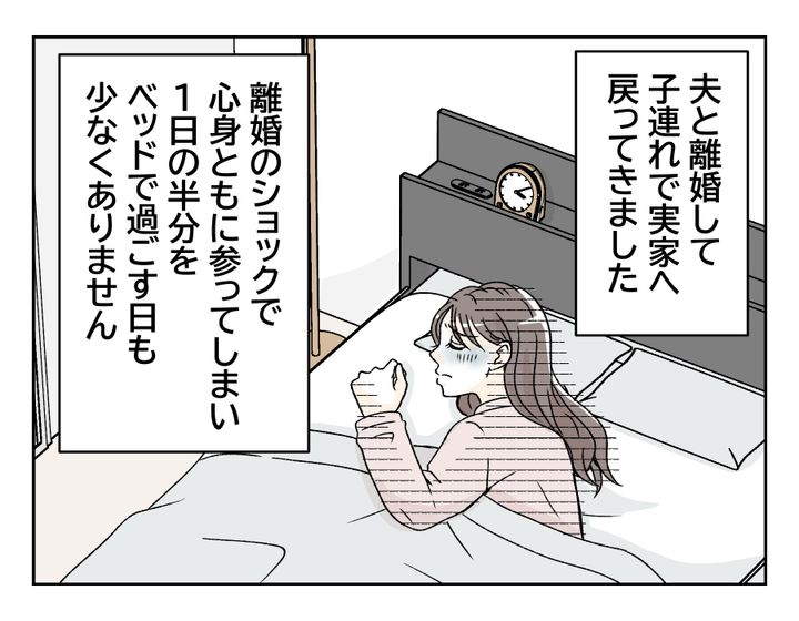 今回の主人公は30代のクルミさん。旦那さんの浮気が原因で離婚し、小学生の子ども2人を連れて実家へ戻りました。しかし離婚のショックから心身ともにバランスを崩してしまい、家事もできず、仕事もできず……1日の半分をベッドで過ごすような毎日です。