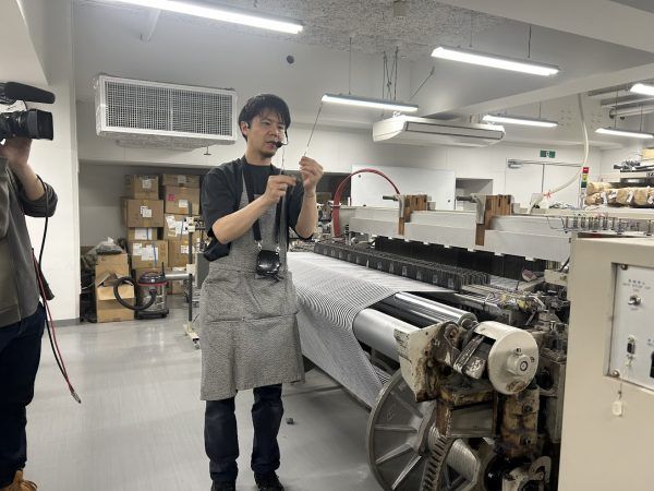その工程を工場長の三満田(みまんだ)さんが詳しく説明してくださいました!糸を染色工場へ発注→整経(せいけい)機にかける→織機にセットして織る→検反(けんたん)するという工程だそうです。機械とその際の作業一つ一つの説明をうかがい、機械織によって量産化に成功したとはいえ細やかに人が作業して丁寧に作り出されてようやくこの美しい縞縞(しましま)が生まれるのだという事がわかりました。