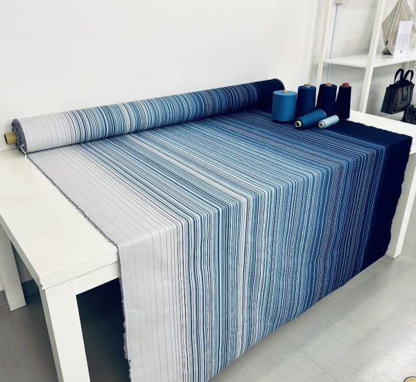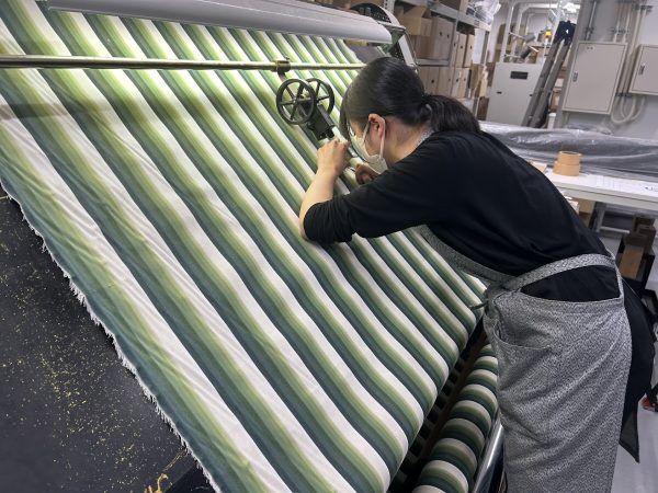 「小倉織」は江戸時代から豊前小倉藩に伝わり、一般的な織物の2倍以上の経(たて)糸を高密度に織り上げ、地厚で丈夫、しなやかな質感、立体的で美しいたて縞(じま)グラデーションが特徴の綿織物です。昭和初期には小倉に機械織の工場がたくさんありましたが時代とともになくなり一度は途絶えてしまいました。その後、今回の受賞者の一人であり小倉 縞縞 専務の築城弥央(ついきみお)さんの母で染織家の築城則子(ついきのりこ)さんにより手織りで復元・再生されました。2007年には外注による機械織に成功し「小倉 縞縞」が誕生。タイムリーなデザイン開発を目指し2018年に工場を設立しました。現在は小倉織だけでなく、その伝統技術をもとに「木綿とウール」の自然素材をミックスするなどオリジナル生地の開発・製造を行い革新的なインテリア向けファブリックとして国内外で新市場の開拓を進めています。今回は「小倉織」の量産化・内製化による独自生地の開発及び関連製品の市場拡大が認められ「ものづくり日本大賞」優秀賞に輝きました。