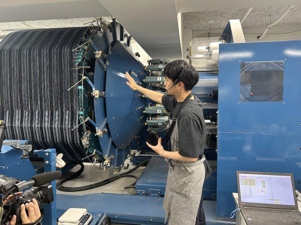 整経:経(たて)糸をデザイン通りに並べる工程を行います。作業中は大きな音ですが帰宅前に糸をセットしておくと自動で動いてくれるそうです