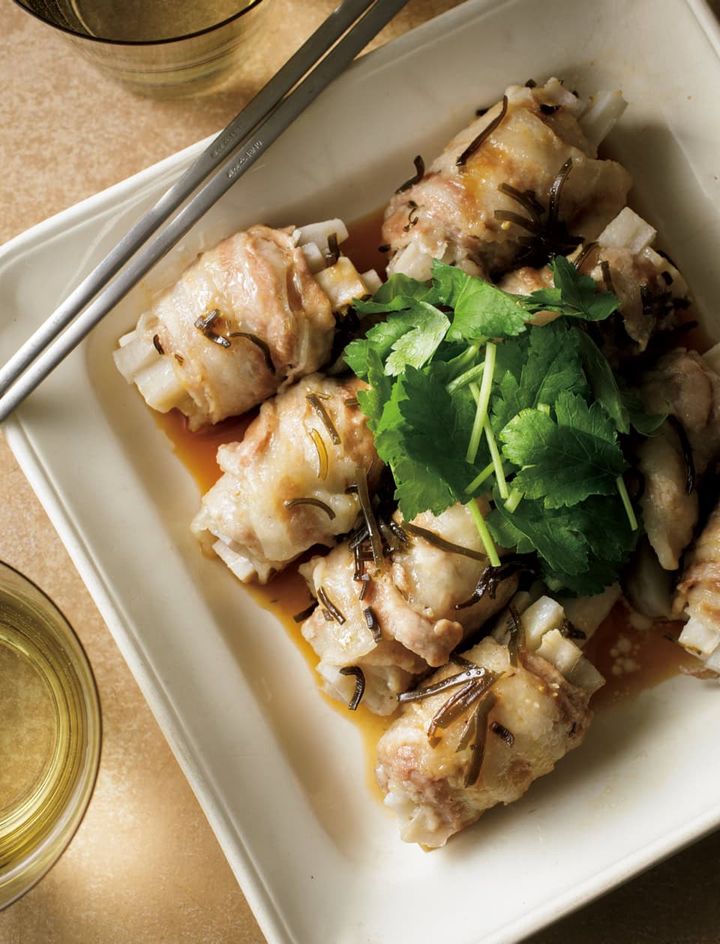 ② ➊の巻き終わりを下にして耐熱皿に並べ、塩昆布を散らして酒、しょうゆを回しかける。ふんわりとラップをかけて電子レンジ(600W)に入れ、8分ほど加熱する。器に盛り、三つ葉を2cm幅に切ってのせる。