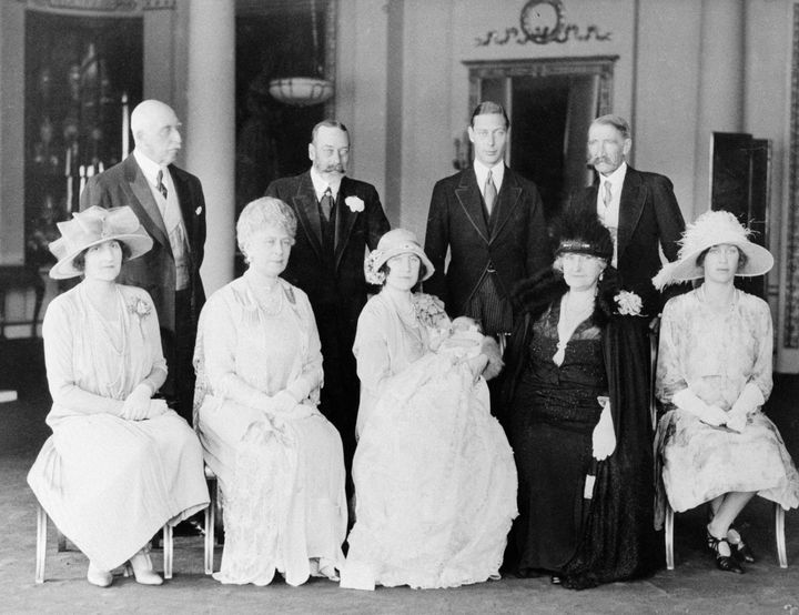 エリザベス王女の洗礼式にて。両親や祖母メアリー王妃、ジョージ5世、コノート公、ストラスモア卿夫妻たちに囲まれて。