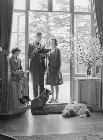 ウィンザー城で読書中のマーガレット王女とエリザベス王女。傍らには、安心しきった様子で床で眠るコーギーが。
