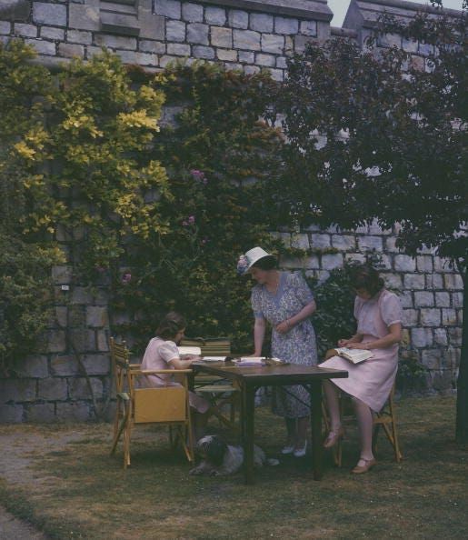 読書をするマーガレット王女とエリザベス王女を見守るクイーン・マザー。まるで絵画のような一枚。