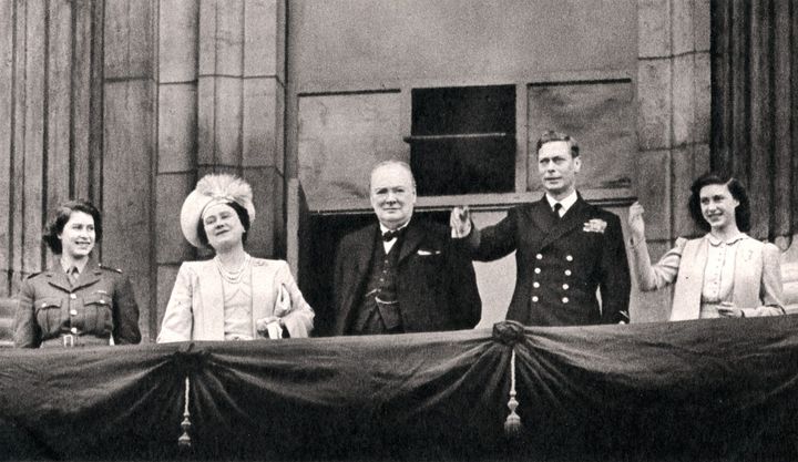 ヨーロッパ戦勝記念日と第二次世界大戦の終結を祝うべく、当時の首相ウィンストン・チャーチルと家族とともに、バッキンガム宮殿のバルコニーにおでまし。