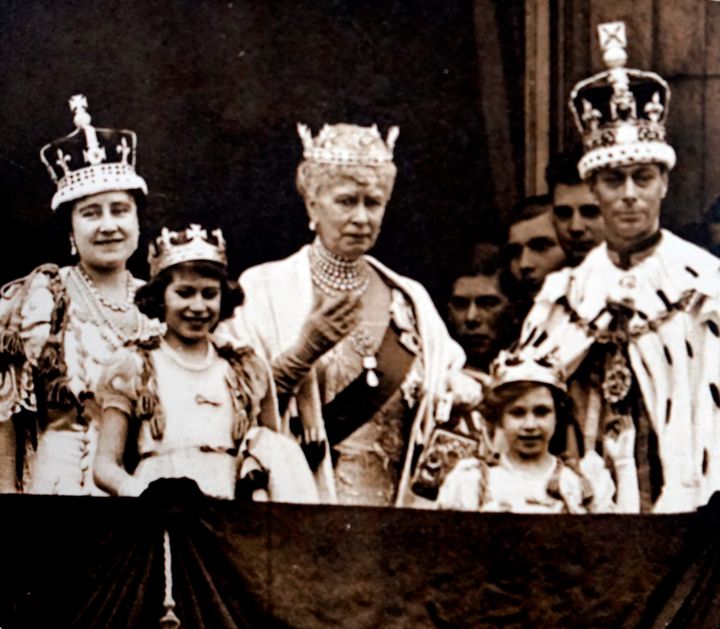 国王ジョージ6世の戴冠式を祝って、バッキンガム宮殿のバルコニーから観衆に挨拶をするロイヤルファミリー。