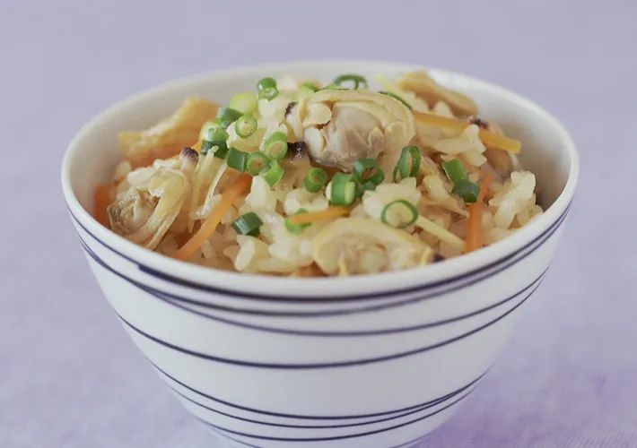 5.炊き上がったら、アサリ、針ショウガを混ぜ込み、10分ほど蒸し、器に盛りつけたら万能ネギを散らしてでき上がり。