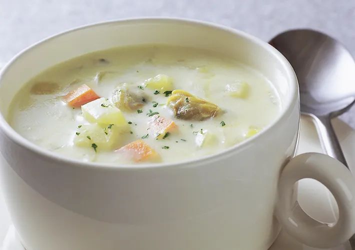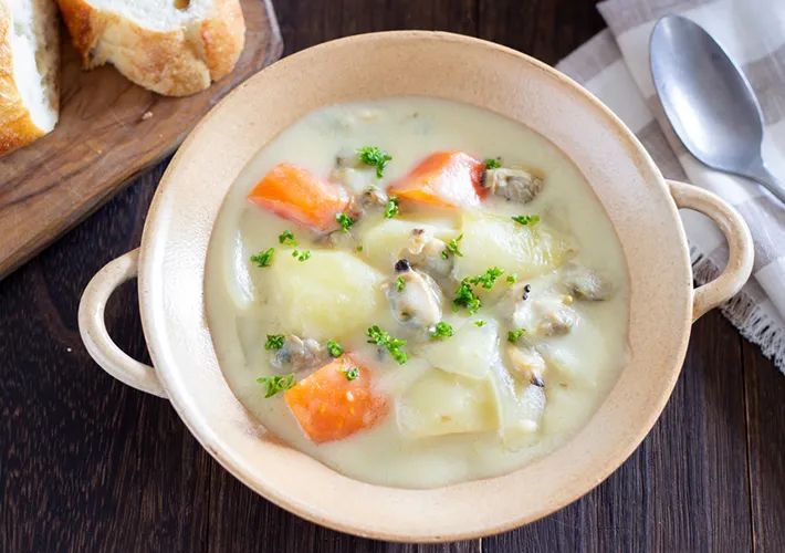 5.全体にとろみがつき野菜に火が通ったら、アサリ、生クリームを加えて一煮立ちさせ、ローリエを取り出し、コショウで味を調えます。器に盛りつけ パセリを散らしたら完成です。