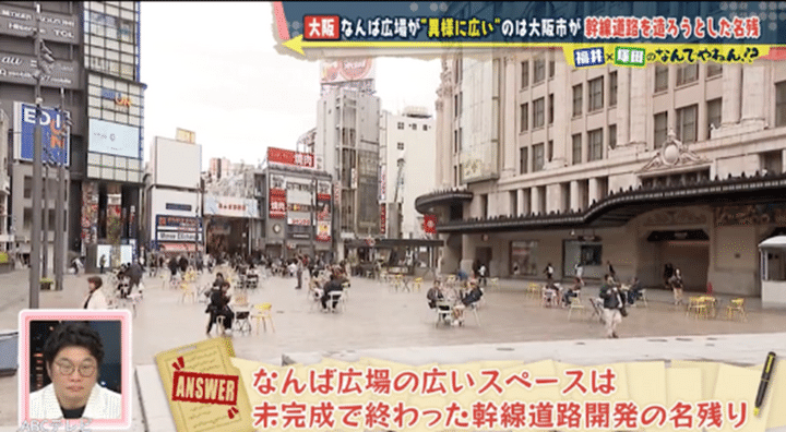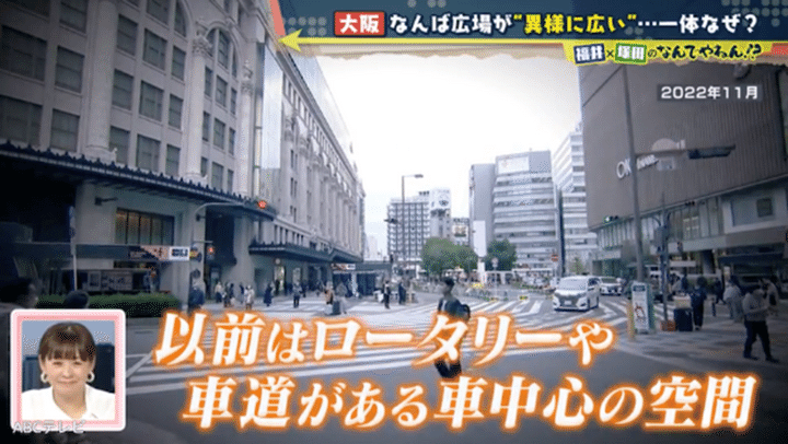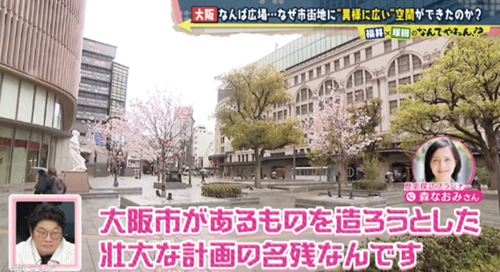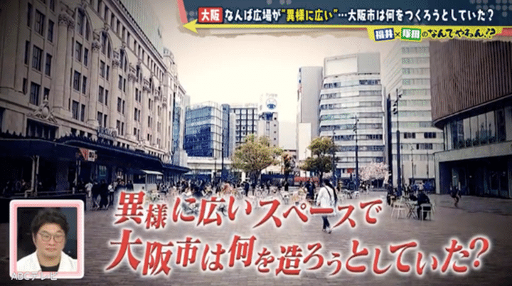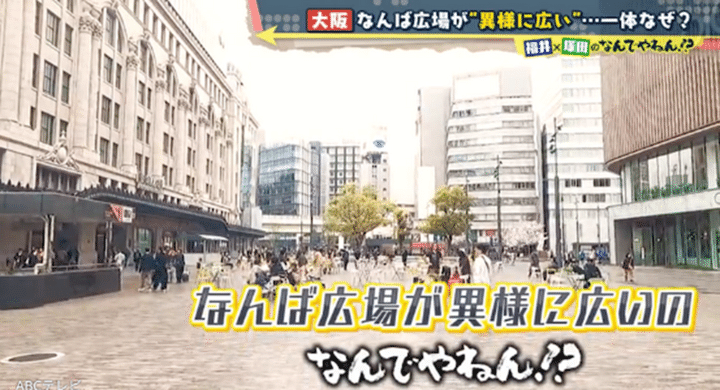 A.B.C-Z塚田僚一とABCテレビの福井治人アナウンサーが、大阪人にはなじみのある、あの「なんば広場」がなんで“異様に広い”のか?の謎に迫った。