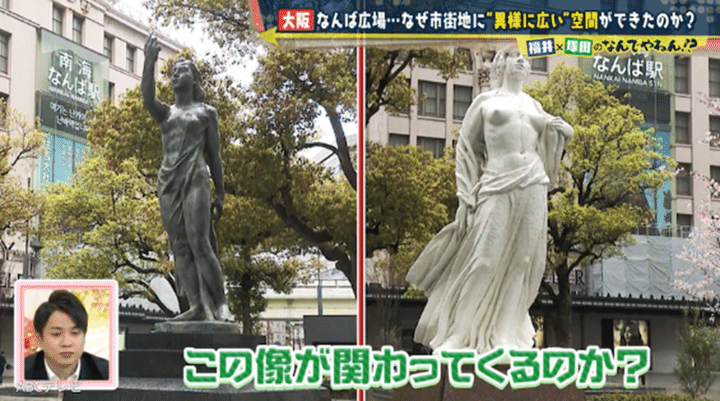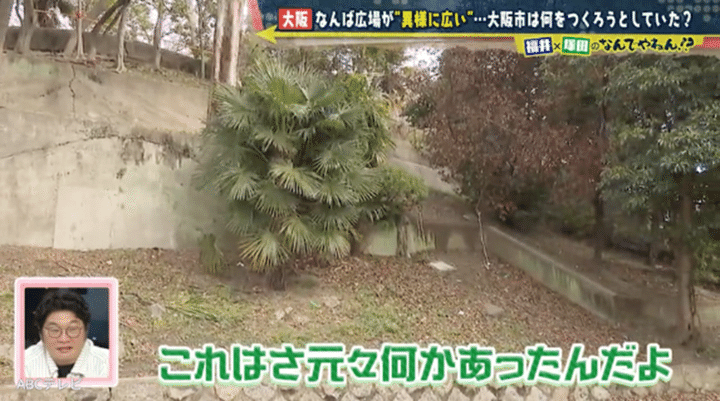 塚田と福井アナは「めっちゃありそう!絶対ある。これそうやん!」と、このコンクリートの塊を、森さんのいう“違和感”と断定! 「なんば広場」に、平和の像があったことも関連付けられるとし、