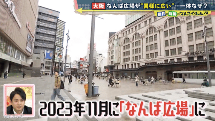 南海・大阪メトロの「なんば駅」の目の前、まさにミナミの中心地である「なんば広場」。かつては車道だったが、2023年から歩行者エリアとなっている。が、改めて見てみると確かに“異様に”広い———。