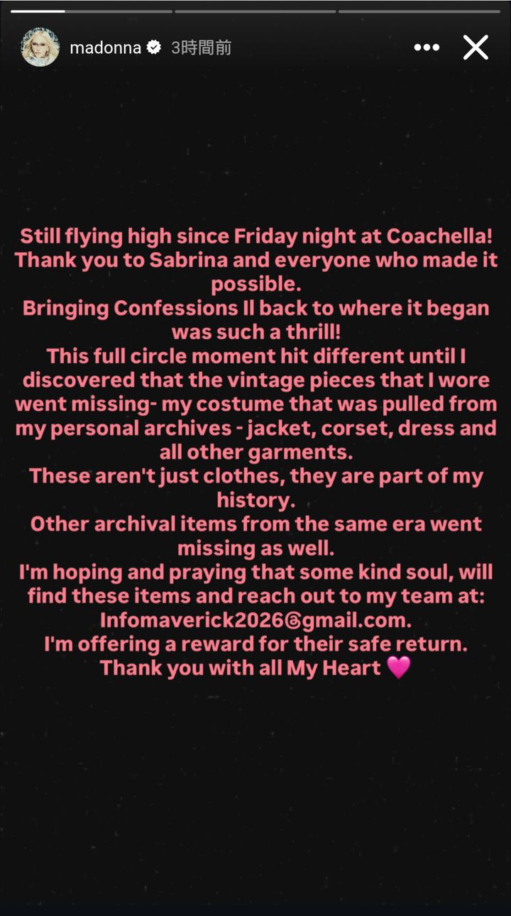 4月20日(現地時間)、マドンナがインスタグラムのストーリーズを更新し、コーチェラ・フェスティバルのステージで着用した貴重なアーカイブ衣装が紛失したことを発表した。