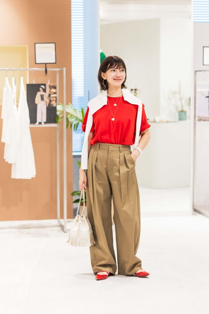 「春は自然と明るいカラーに目がいきます。今季のGUもカラーアイテムがとても充実していますが、中でも目を惹いたのは鮮やかな赤色のTシャツ。大きめサイズをセレクトし、程よくゆるいイメージで抜け感を出しています。タック入りのパンツは、トップスをウエストインしても腰回りを気にせずにすっきりと穿くことができます。気分をあげたい春のお出かけには、カラーアイテムをぜひ取り入れてみて」
