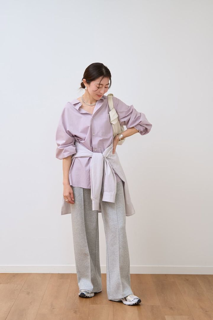 「UNIQLO:Cで、すでにベストセラーのセンターライン入りスウェットパンツ。センターに入ったラインのお陰で美脚効果はもちろん、一見スラックスにも見え、その上ウエスト部分もカジュアルになりすぎないようにすっきりとしたデザインになっているので、きちんとした場面でも活躍してくれそう。春はパープルのシャツを合わせて、シャツinシャツの重ね着使いでコーディネートしたいです」