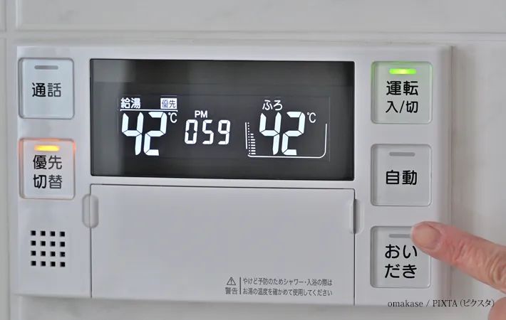 お風呂の『自動ボタン』がオンのままだと、温度を維持するために何度も沸かし直しが行われてしまいます。お湯がたまったらボタンをオフにする習慣をつけ、浴槽の蓋を閉めるとともに、家族が間隔を空けずに入浴することも大切です。
