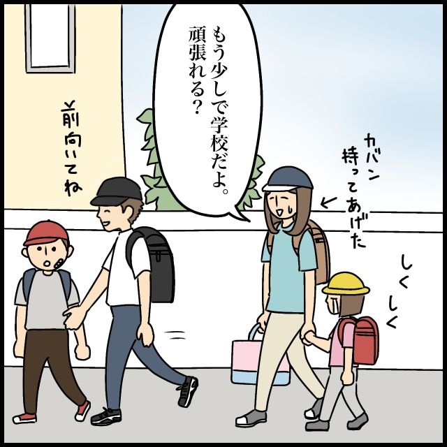 お母さんから女の子の対応を任された班長さんは、泣いている女の子のカバンを持ってあげ、手を繋いで登校することに。班長さんは泣き続ける女の子にずっと優しく声をかけながら歩き、ようやく前方に小学校が見えてきた。「もう少しで学校だよ。頑張れる?」と言いながら、もうすぐ学校に到着するとホッとしていた班長さん。