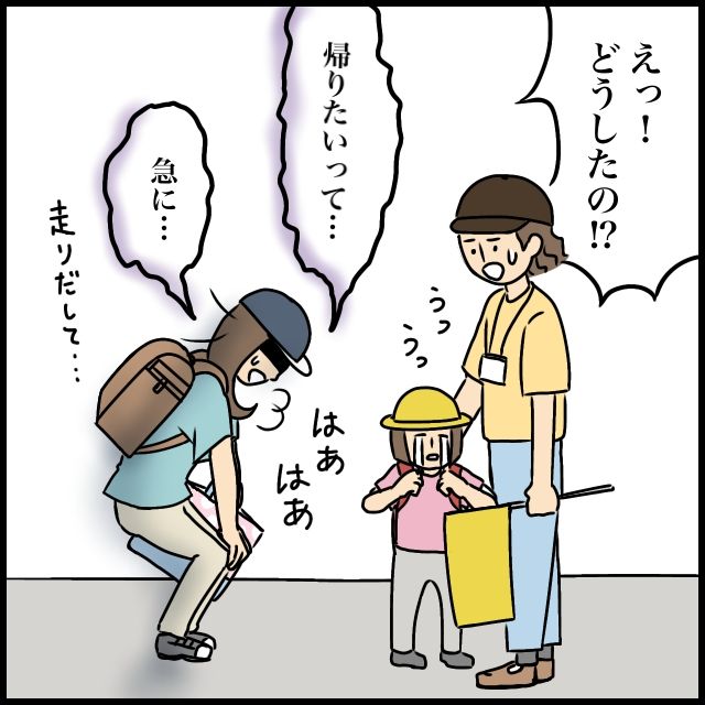 見守りの保護者さんは「えっ!どうしたの!?」と驚きながらも女の子を引き留めてくれ、班長さんは「帰りたいって・・急に・・走り出して・・」と肩で息をしながら事情を説明しました。