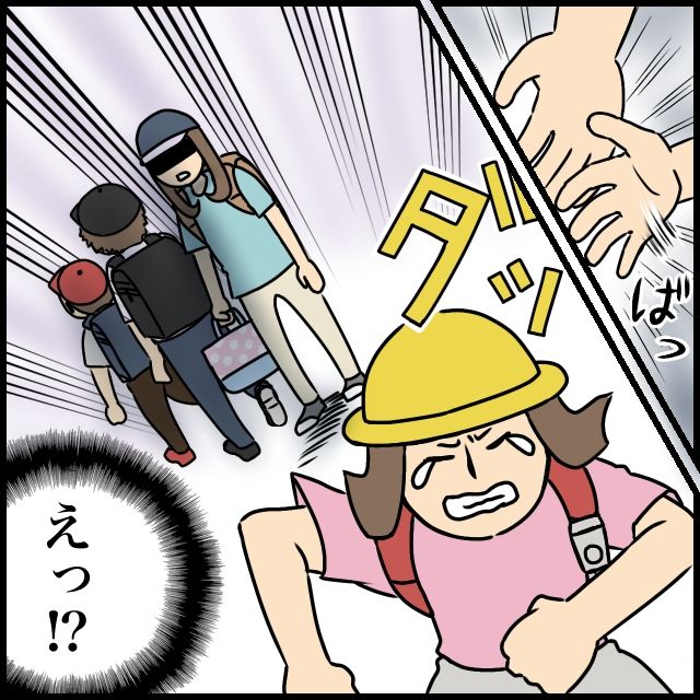 しかしその時。女の子が繋いでいた手を急に振り解き、学校とは逆方向に走り出しました。突然のことに班長さんは「えっ!?」と驚き、呆然と女の子の後ろ姿を見つめます。