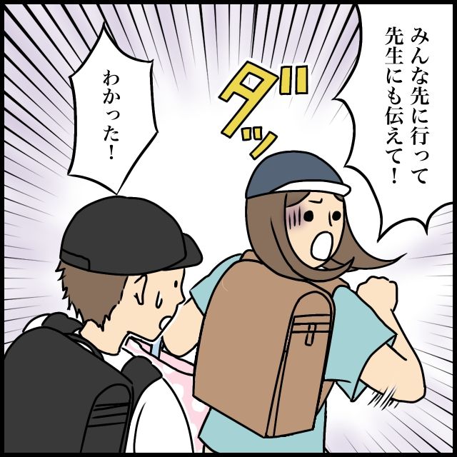 すぐにハッっと我に返った班長さんは、「みんな先に行って先生にも伝えて!」と副班長さんに伝えると、急いで女の子の後を走って追いかけました。