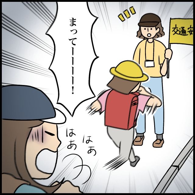走っていく女の子の後ろから「まってーーーー!」と叫びながら息を切らして追いかける班長さん。途中で会った見守りの保護者さんは、学校と逆方向に走っていく2人に気づき驚いた顔。
