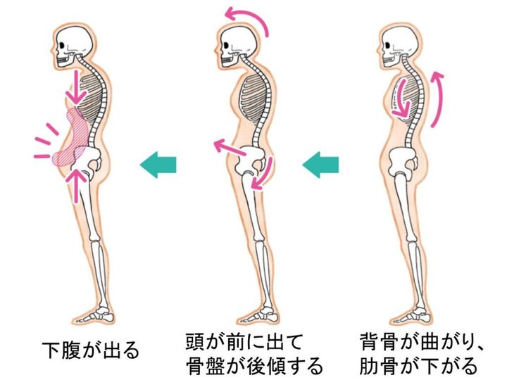 2 バランスを取るように頭・首が前に出て、骨盤が後ろに傾き、腰が前に突き出る