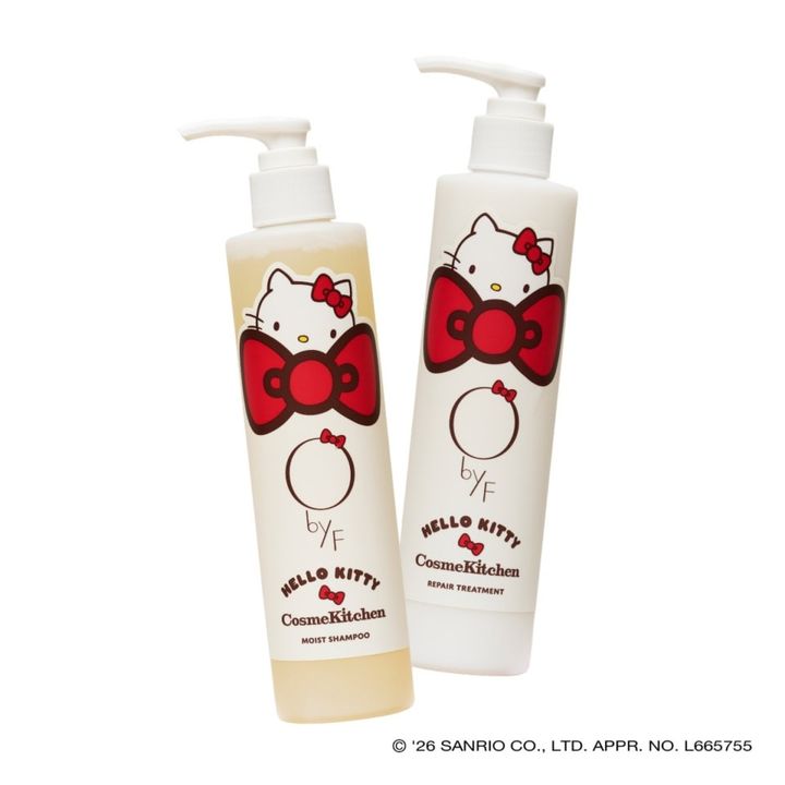 O by F のシャンプーとトリートメント。傷んだ髪もしっとりなめらかにしてくれる人気アイテムです。右から〈HELLO KITTY〉リペアトリートメント 250g ¥3,630、〈HELLO KITTY〉モイストシャンプー 250mL ¥3,080(コスメキッチン)※5月29日発売