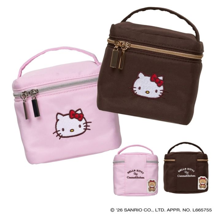 後ろ姿も可愛いバニティポーチ。刺繍であしらわれたハローキティの可愛さはもちろん、180度開くダブルファスナーも嬉しい!〈HELLO KITTY〉 バニティポーチ ピンク/ ブラウン H110╳W110╳D110mm 各¥4,180(コスメキッチン)※5月29日発売