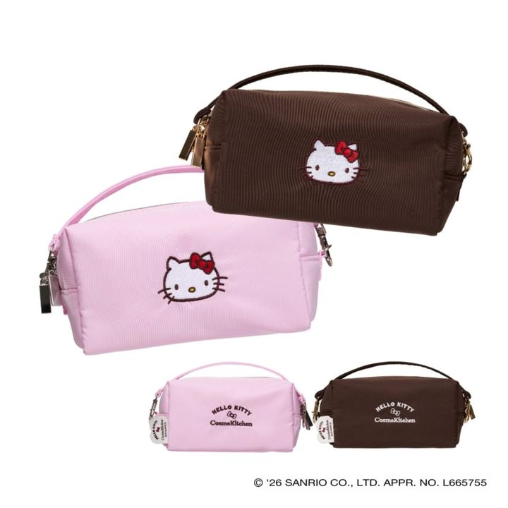 取り外し可能な持ち手がついた2WAYタイプ。ポーチとしてはもちろんミニバッグとしても活躍しそう!〈HELLO KITTY〉 ミニバッグポーチ ピンク/ ブラウン H90╳W180╳D90mm 各¥4,290(コスメキッチン)※5月29日発売
