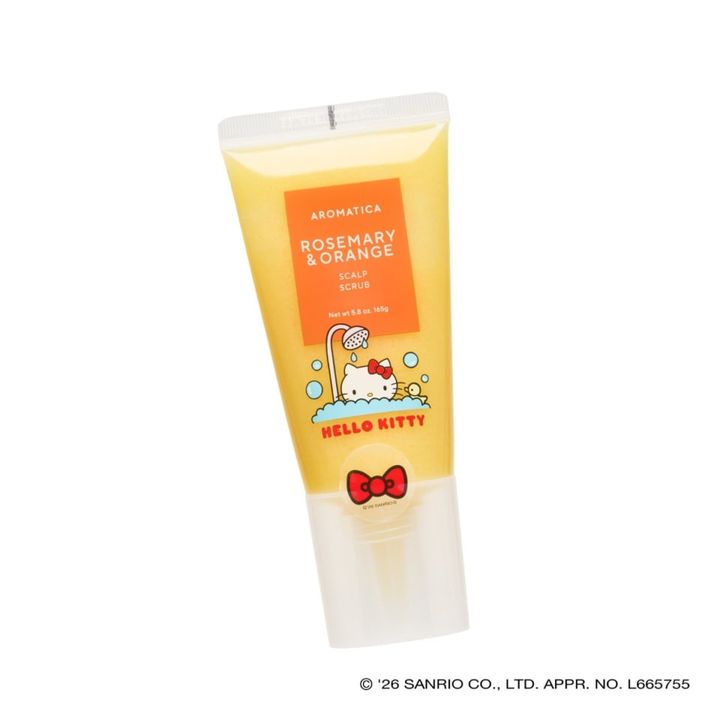 アロマティカの頭皮スクラブはこれからの季節の必須アイテム。入浴中のイラストも可愛すぎる!〈HELLO KITTY〉ローズマリー&オレンジスカルプ スクラブ 165g ¥2,310(コスメキッチン)※5月29日発売